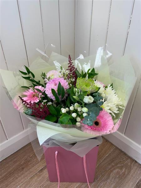 Handtied bouquet with seasonal pink and white flowers.
